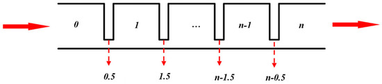 The 1-D flow needs to be discretized to facilitate the model. As for the leakage flow at sealing teeth, the flow experiences a process of expansion. There must be a point where the axial velocity reaches maximum and the static pressure reaches minimum, and this point is used as the computational site of the sealing teeth. For the leakage flow at sealing chambers, the main flow is decelerated by the whirling motion in sealing chambers. There must be a point where the axial velocity reaches minimum, and this point is used as the computational site of the sealing chambers. Then, the sealing chambers are represented by 0 to n and the sealing teeth are represented by 0.5 to n − 0.5. See Figure 3 for details.