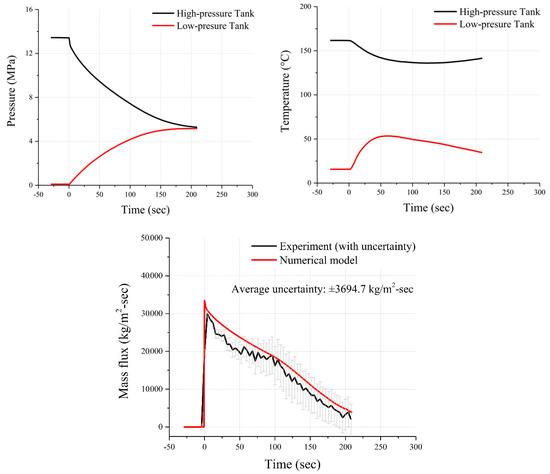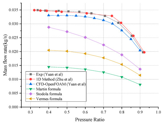 Kim’s single round-hole leakage experiment used a high-pressure tank as the upstream and used a low-pressure tank as the downstream [4]. The initial condition of high-pressure tank is 13.5 MPa and 160 °C and the initial condition of low-pressure tank is normal temperature and pressure. As the valve between high-pressure tank and low-pressure tank is opened, the huge pressure difference causes critical flow in the beginning. As the pressure of different tanks gradually balances, the leakage flow turns into non-critical flow in the end and the whole experiment lasted about 210 s as is shown in Figure 6. The mass flux was obtained by calculating the mass difference of the tank for every second. So, the uncertainty is severely affected by the measure of temperature and pressure, which leads to an average uncertainty of ±3694.7 kg/m2. Applying the definition of C to analyze the experimental results in Figure 6, the variation curve of C with pressure ratio can be obtained in Figure 7. The C increases with the decrease of the pressure ratio when the leakage flow is under critical condition (pressure ratio < 0.6), and C basically keeps unchanged on the area of non-critical flow. The experimental results indicated that when outlet pressure is equivalent to atmospheric pressure, the critical pressure ratio at the outlet reaches the maximum, so does the flow discharge coefficient C. The single round-hole has the diameter (c) of 1.5 mm and length (w) of 5.0 mm, so the w/c is 10/3 and a preliminary experimental correlation of C can be obtained, as is shown in Equation (14), which may not be very accurate due to the uncertainty of measurement.