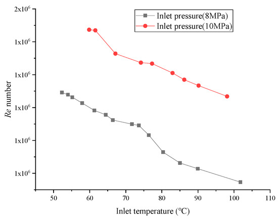 As summarized in Table 2, viscosity of SCO2 is close to that of air, and the density of SCO2 is about 400 times higher. Based on the see-through labyrinth seal in Figure 5 and the definition of Reynolds (Re) number at sealing teeth (Equation (12)), Table 2 tries to compare Re number at the second sealing teeth of SCO2 and air as working fluid. The Re number of SCO2 flow is over 105, and it is turbulent flow, but the air flow has a Re number less than 2300 and is basically laminar flow. The internal flow velocity profiles of the two kinds of flows are different. The laminar flow follows a quadratic parabolic velocity distribution, while the turbulence flow follows the power exponential distribution, especially when the Re number is about 105 and the power index is 1/7, known as the Karman–Prandtl’s 1/7th power law, and it was proven by Nikuradse through experiment. So, the turbulent flow has a higher average axial velocity, and it can be expected that the SCO2 labyrinth seals have a higher flow discharge coefficient than that of air labyrinth seals.