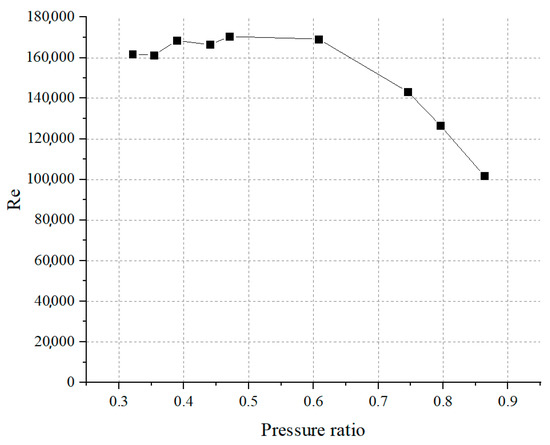 After completing the iteration computation from the computational site n − 1 to n − 0.5 and the computational site computation from n − 0.5 to n, the computation process of a sealing unit (including a sealing chamber and tooth) is completed. If there is a sealing tooth n+0.5 behind the sealing chamber n, the computation processes listed in Section 2.2.1 and Section 2.2.2 are repeated until computations of all sealing units are completed. An outlet pressure of the last sealing unit is Pout. Then, for a given expected flow , the pressure ratio of the labyrinth seal is Pout/P0.
