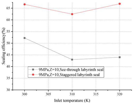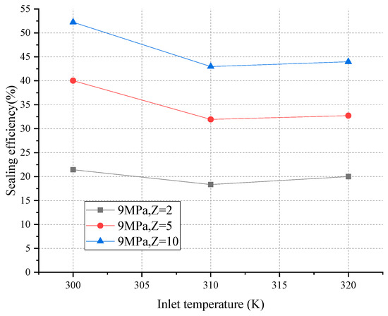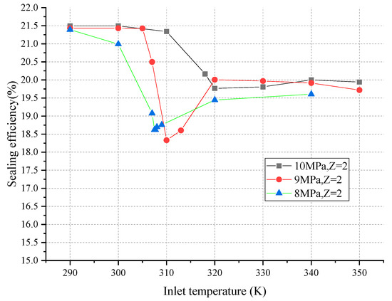 - The minimum values of the sealing efficiency exist and are at the inlet temperatures near the pseudo-critical temperature.