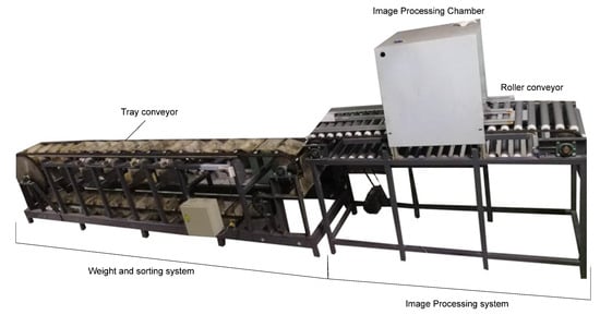 A system in Figure 1 is designed and developed for this study. The sorting system consists of two main parts. The first part is the image processing system that implements conventional image processing using a series of algorithms that convert unstructured data into structured data to extract three external features such as length, width, and defect. The external features of mangoes can be extracted by various methods such as image processing, ML, and deep learning. In this study, the image processing is more efficient, because of its fast processing time without a large training dataset. This method changes processing parameters, which are determined more difficult in both ML and deep learning. The extracted features of the captured image are combined with weight to generate a full data set in order to leverage machine learning models. The second part is the weighting and grading system to classify mango into G1, G2, and G3.