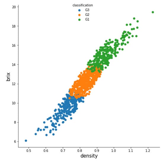 The relationship of the features is the linear or nonlinear relationships shown in Figure 18. Therefore, we should not apply the linear model to grade of mango. The data is divided into 3 parts including training data, validation data, testing data. The samples divided into three parts with 3194 training data visualized in Figure 19, remaining data includes 771 validation, and 1035 testing. The distributing data on the boundary clusters obviously. The clusters in the middle of the data field are complex to classify. Besides, the area of density (0,0.67) and (1.03,1.2) are obvious, it is difficult to determine the boundary of the remaining area of density (0.67,1.03). Because the area of density is small or large, it is easy to identify the type of mango. Meanwhile, the mango classification of the region (0.75,1.03) is difficult to decide the types of mango, because these types depend on other grading factors as weight and volume.