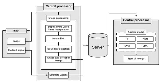 The operating procedure of the system is summarized in Figure 4. Input data is processed and then ML is applied to classify mango simultaneously by the central processor. The input data undergoes several image processing algorithms to achieve structured data including length, width, defects, and weight, then saves all this data to the server. At the same time, the central processor takes data from the server to train the model and then gives predictions whether the mango is G1, G2, or G3.