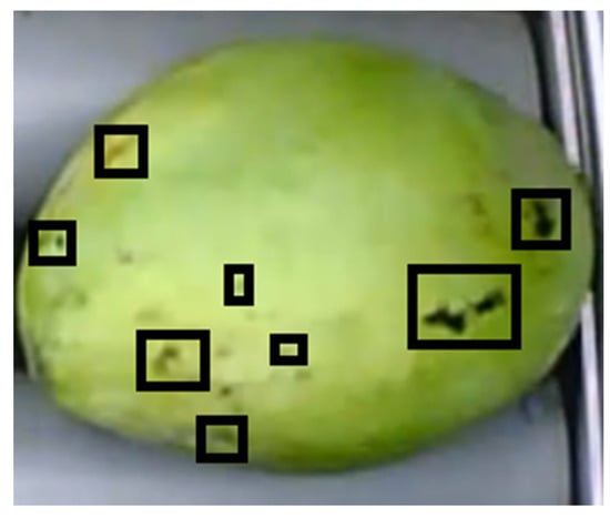 The defect of the mango is the damage on the surface caused by insects or collisions during its growth that can be scars, dark, spots, etc. The defect areas are detected by the boundaries of the rectangle (Figure 6). All defects are accumulated on the whole surface and then give the final defect level of each mango. Therefore, the areas of its disability should first be detected and zoned to be detected effectively based on the specific areas of the binary image. The disabled areas are quite small, so they should be covered by the rectangle, so the area of the disability is the area of those rectangles. The mango defects are identified by the total pixel’s area of the zero value inside the mango boundary in the binary image. Because the pixel size ratio is K, the area of each pixel is K2. Where Adefect is the number of defect pixels, () is estimated defect; (∆de) is error of defect depending on the error (ε) of K. We can calculate the actual defect by Equation (25).