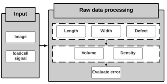 The estimation of volume and density depends on the shape of the mango, which varies by region and country. Therefore, the shape is extracted before estimating its volume and density. The harvested mangoes from orchards are shown in Figure 7. These mango samples are measured by the vision machine and then weighted to generate the data. The prepared data for training models are structured data converted from image and weight signal. The estimation of volume and density consists of 3 steps. In the first step, length, width, and defect are extracted from the captured image by a camera. In the second step, the length, width, and defect are combined with the weight to create the completed dataset. Finally, the volume and density are predicted approximately based on length and width and then its errors are evaluated. The schematic of the preprocessing procedure for predicting the volume and density is shown in Figure 8.