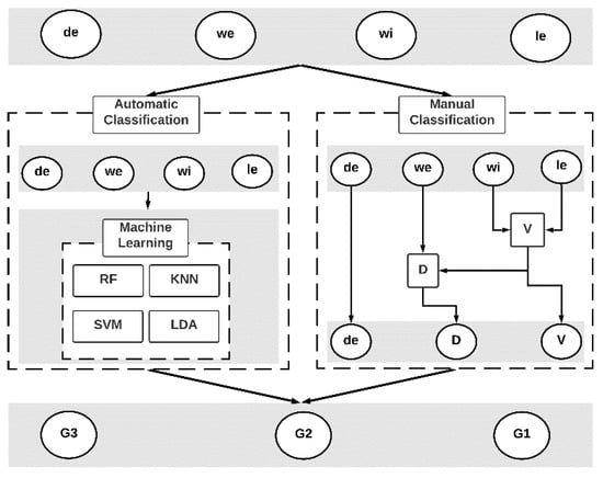 Dataset is generated by manually grading mango based on density (D), volume (V), and defect (de). This manual grading is carried out by agricultural experts from Vietnam. The labeled types including G1, G2, and G3 of mangoes are measured by D, V, and de from four extracted features de, we, wi, and le. Instead of estimating density and volume to classify mango type, in automatic classification, four models namely RF, LDA, KNN, and SVM are trained and evaluated by the labeled dataset obtained from the manual grading. The hardware and software of the sorting system were presented in Section 2 and the grading standard is shown in Table 1.