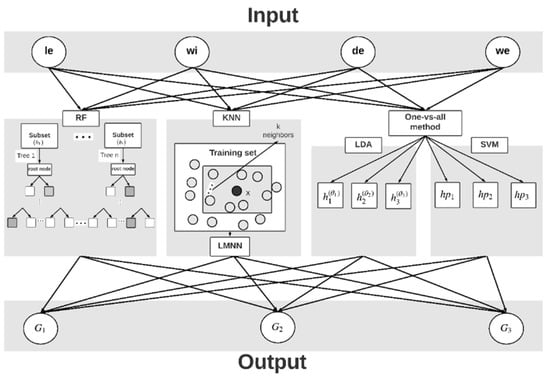 The supervised ML models and implementation platforms suitable for the prediction of types of mango are determined by comparing prediction accuracies. Additionally, the optimized parameters of each model to fit the data of mango are discussed. Following analysis of the data to determine the relationship of variables, models are fitted into their parameters to achieve the most effective performance. In the previous studies, several classification models demonstrate the efficiency in grading mango as SVM [3,5,8], LDA [5,6,9], RF [10], and KNN [11]. Hence, in this paper, SVM, LDA, RF, and KNN models are applied and compared to find the most accurate model in mango classification. The framework of the training process is shown in Figure 11, which includes six parts: Input, output, Random Forest (RF), K-Nearest Neighbors (KNN), Linear Discriminant Analysis (LDA), and Support Vector Machine (SVM).