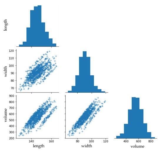 The density of mango cannot be determined indirectly, therefore the density should be predicted by the volume and weight estimated by captured images and load-cell, respectively. In this study, the mangoes are graded and classified into three groups: G1, G2, and G3 with the highest quality being first grade (G1). The steps of the image processing were experimented as shown in Figure 12. The vision machine system took the data from the captured digital images of camera and used the platform to determine the parameters of mango using specific functions. The mangoes entered the vision chamber by a roller conveyor system and were captured by a camera. In each RGB image, the mango’s defect, length, and width were extracted through the image conversion stages: Calibration image, HSV image, and binary image. In Figure 13, The distributions of length, width, and volume in the dataset have a shape similar to the Gaussian function. Besides, we observed that length and width have a linear relationship to volume (V). Hence, the volume of mango is predicted from its length and width based on the prediction model of linear regression shown in Equation (31).