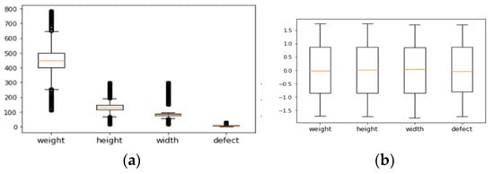 The importance of data normalization and elimination of outliers (DNEO) in model accuracy was mentioned in Section 7. The impact of the DNEO process on model performance is therefore presented in this section. As can be seen from Table 3, four features are in very different ranges which are determined by min and max values of variables. The ranges of we, he, wi account for (112,784), (15,300), (16,300), respectively while that of defect only from (0–29) and it is the lowest scale. Although de is important as a predictor, it intrinsically influences the result less due to its smaller value. After using the DNEO process, in Table 4, there is a significant decrease of 218 outliers in the original data. In Figure 14a, the data points beyond the smallest, and the largest observation is considered outliers. Hence, there are a lot of outliers to remove in this data. Figure 14b indicates that the range of features is normalized to about (−1712, 1737). The effect of data normalization and elimination of outliers (DNEO) on the accuracy of the models is shown in Figure 15.