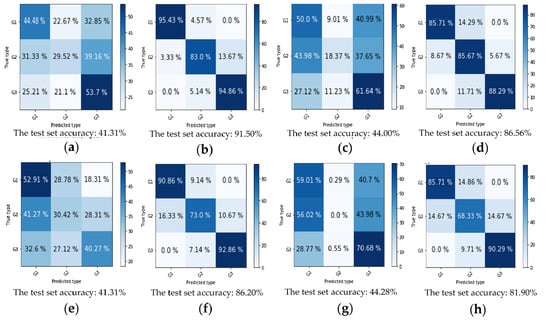 The effect of the data normalization and the elimination of outliers on the performance of models. (a) RF without DNEO, (b) RF with DNEO, (c) LDA without DNEO, (d) LDA with DNEO, (e) KNN without DNEO, (f) KNN with DNEO, (g) SVM without DNEO, (h) SVM with DNEO.