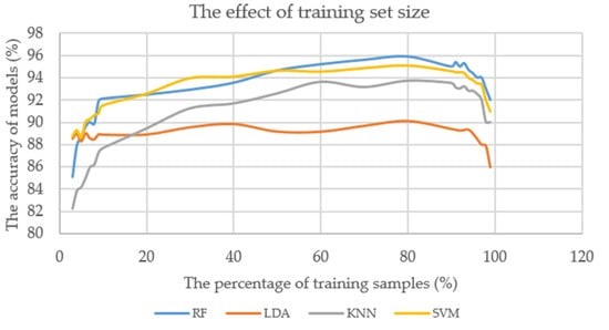 The model’s performances show that parameter selection in the NCV method is important for controlling overfitting. The separation of the initial data into training and testing data gives a smaller effect. The accuracy of RF, LDA, KNN, and SVM increase significantly to 98.1%, 87.2%, 94.8%, and 92.7%, respectively. The RF model obtains the highest accuracy at 98.1% if (n_estimators) is range from 80 to 100 and the nodes are expanded until all leaves are pure. The accuracy of the SVM model using Kernel function (rbf) is up 92.7% with γ and C ranged from 0.3 to 1 and 70 to 100, respectively. Moreover, the KNN model has a high accuracy of 94.8% in the number of neighbors ranging from 30 to 60. Finally, when reducing the number of features returned to 1, the LDA model allocates 89.6% accuracy.