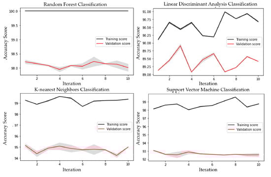 The performance of the models was determined by testing data divided 10 times in the outer layer. The estimation of accuracy (Figure 17) was implemented 10 times corresponding to 10 folds in the outer layer. The performances of four models with adjusting their parameters were evaluated by validation and testing data. The horizontal axis denotes the evaluating iteration of model performance and the vertical axis denotes the percentage of model performance. The black line in the figure presents the training score and the red line denotes the validation score of models with the best parameters. The training and validation scores were determined by validation and testing data, respectively. Finally, the gray area around the red line shows the standard deviation in the outer layer performance of each fold.