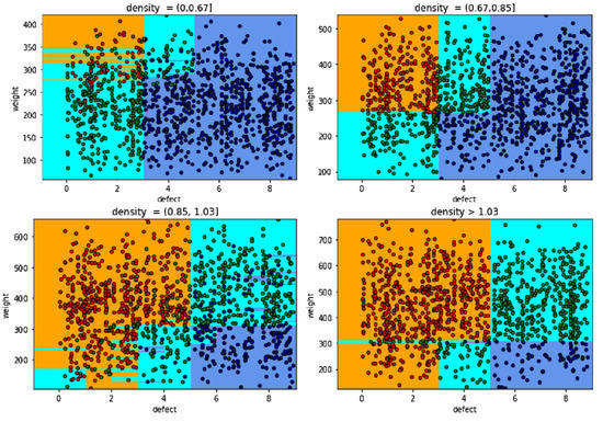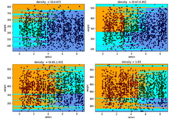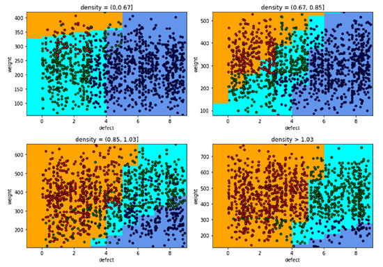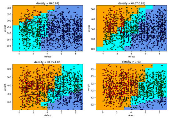 Similarly, grading results evaluation in field of density (0,0.67), and (1.03,1.2) is exact. The classification results in the density (0.67,1.03) also give more accurate results than the model of LDA, because this area is clustered by the hyperplanes, and it makes the classification more flexible. The classification based on the SVM model is reliable. However, there are inexact grades for classifying, because intersections of types blend together. Another model can support to solve inexact classification being KNN. It is an algorithm that works and is considered based on predicted points, which affect the classification results and accuracy. The accuracy of the prediction is the proportion inversely neighbors of predicted points. If the number of neighbors are 30, the KNN model gives grading results shown in Figure 22.