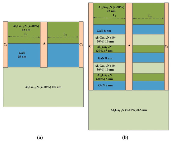 The cross-section device structure of the AlGaN/GaN SPD is schematically shown in Figure 1. Figure 1a introduces the diode with AlGaN/GaN/AlGaN hetero-epitaxial structure, and only one 2DEG channel is introduced in the diode. The Al0.1Ga0.9N back barrier layer was introduced to enhance the confinement of the quantum well and avoid the formation of a parasitic channel. The trench anode was etched through at least the 2DEG channel to ensure that the 2DEG channel was divided into two individual channels. In order to further enhance the output characteristics of the trench anode Gunn diode, we also introduced a multi-2DEG-channel structure in the diode, as shown in Figure 1b. The multi-2DEG-channel structure mainly consisted of a 22 nm-thick un-doped Al0.3Ga0.7N barrier layer, multiple combinations of AlGaN/GaN hetero-epitaxial layers, and a 0.5 µm-thick Al0.1Ga0.9N back barrier layer. The number of 2DEG channels was controlled by the number of the combinations of the AlGaN/GaN hetero-epitaxial layers: one combination for two channels, two combinations for three channels. Furthermore, a combination of AlGaN/GaN hetero-epitaxial layer consists of a 15 nm-thick AlGaN barrier layer (10 nm-thick un-doped Al0.1–0.3Ga0.3–0.7N upper layer and a 5 nm-thick un-doped Al0.3Ga0.7N middle layer) and an 8 nm-thick undoped GaN channel layer (bottom layer). In the upper barrier layer, Al composition gradually changes from 10% to 30%. Theoretically, in one combination of AlGaN/GaN, higher Al composition of the barrier layer results in higher electron concentration of the 2DEG channel in the GaN layer; however, this also leads to a shallower quantum well (that is, a lower electron concentration of the 2DEG) in the upper AlGaN/GaN combination and a higher lattice mismatch between the AlGaN and the upper GaN layer. Therefore, we chose a composition gradient barrier layer in the first 10 nm, and 30%-Al-composition barrier in the second 5 nm.
