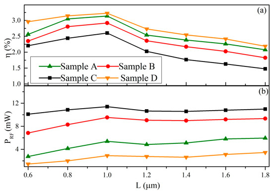 (a) The RF-to-DC efficiency η versus the channel length L; (b) the RF output power PRF versus L.
