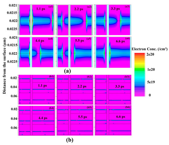 The schematic of the formation process of the electron domain in the asymmetric self-parallel planar Gunn diode (SPD) where L2 = 1.2 µm = 2L1: (a1–a6) single-2DEG-channel SPD and (b1–b6) triple-2DEG-channel SPD.