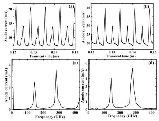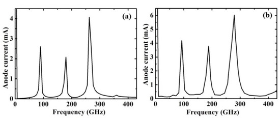 We further verified the motion of the electron domains in the multi-2DEG-channel SPD as L2 = 1.8 µm = 3L1. Similarly, before the dipole domain of the right channels leaves the anode electrode, the formation and movement of the electron domain repeat almost three circles in the shorter channel, which results in three current peaks in the oscillation current waves. Therefore, as shown in Figure 7, the third harmonic component is greatly enhanced in both SPDs at the frequency of around 280 GHz.