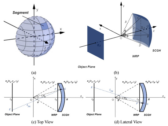 According to the spherical wave diffraction theory, an arbitrary point on the object plane can be expressed by the superposition of the diffraction distributions of all points on the SCGH. The schematics are as shown in Figure 1c,d. The reconstruction process by PS method can therefore be given by