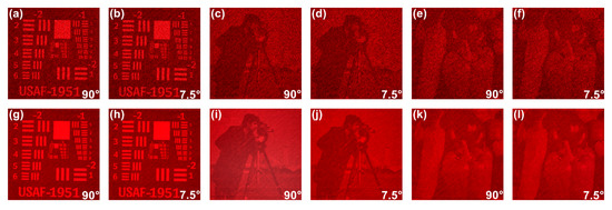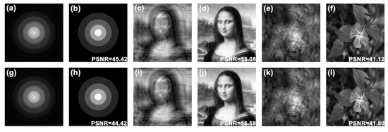 Three pictures including , and are used for optical experiments. Moreover, the optical reconstructed results are shown in Figure 11 where SCGHs with corresponding flare angles of and are shown as representatives. The SCGHs can be correctly reconstructed as shown in Figure 11a–f, which further validates the feasibility of the proposed method. However, the reconstructed images are with obvious speckle noise since one phase-only hologram is used for each reconstruction. Therefore, the time division multiplexing method is used as optimization to suppress the speckle noise and improve the image quality as shown in Figure 11g–l [23]. All the results are in accordance with our theoretical analysis.