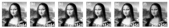 In the second set of simulation, object planes of different resolution are compared by PS and PC methods. The reconstructed results with different resolution are shown in Figure 5 and Table 1. In addition to PSNR, the SSIM is used simultaneously as a quality measurement in this simulation. With the resolution of the object plane increasing, the PSNR and SSIM of the results reconstructed by both methods decline because each pixel introduces error in the process of applying the PC method. However, the clearly reconstructed images in Figure 5 prove that the proposed method works well with various of resolution.