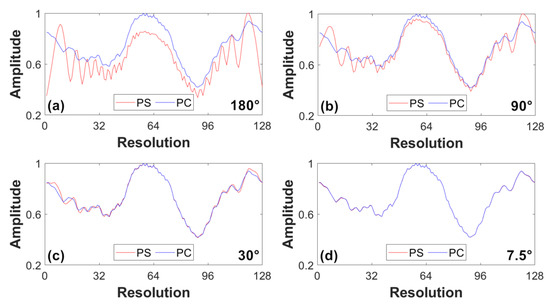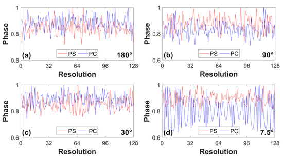 Based on the error analysis in Section 2.4, we measured the error in both amplitude and phase between the diffraction distributions calculated by PS and PC methods. For each result, we accumulated and normalized the elements of the amplitude and phase matrix in columns as shown in Equation (12):