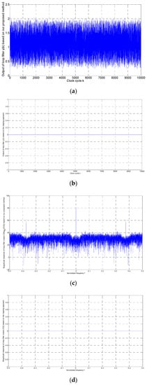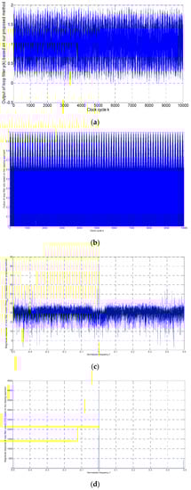 Now, consider another input step size. Here, the input step size is incremented by 0.01. More precisely, an input step size of 0.25 is applied. That is, for . Figure 3a,b show the outputs of the loop filters when our control strategy and the clipping method [7] are applied, respectively. Figure 3c,d show the magnitude responses of the outputs of the loop filters when our control strategy and the clipping method [7] are applied, respectively. It can be seen from Figure 3a,c that the sigma delta modulator exhibits the similar behavior as before if our proposed control strategy is applied. On the other hand, it is worth noting that the increase in the input step size causes the absolute value of the output of the loop filter greater than or equal to one at every time instant if no control force is applied. Therefore, if the clipping control strategy [7] is applied, then the clipping action takes place at every time instant. Hence, it can be seen from Figure 3b,d that the output of the loop filter is always equal to zero if the clipping control strategy [7] is applied. In this case, the sigma delta modulator is not working properly.