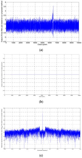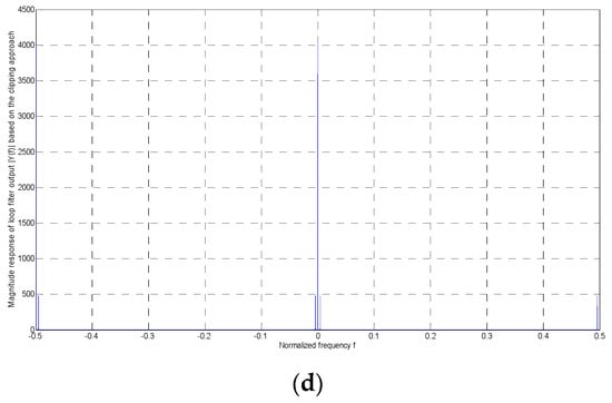 As the phases of the eigenvalues of are , , , and , the sinusoidal inputs with the angular frequencies equal to and are applied for the illustration purpose. Here, the amplitude of the sinusoidal input is equal to 0.24, which is chosen the same as before for the comparison purpose. For the simplicity reason, there is no phase shift on the sinusoidal input. Figure 6a,b show the outputs of the loop filters when the angular frequency is equal to under our control strategy and the clipping method [7], respectively. Figure 6c,d show the magnitude responses of the outputs of the loop filters when the angular frequency is equal to under our control strategy and the clipping method [7], respectively. Figure 7a,b show the outputs of the loop filters when the angular frequency is equal to under our control strategy and the clipping method [7], respectively. Figure 7c,d show the magnitude responses of the outputs of the loop filters when the angular frequency is equal to under our control strategy and the clipping method [7], respectively. It can be seen from both Figure 6 and Figure 7 that the sigma delta modulator exhibits the similar behavior as before for our proposed control strategy.