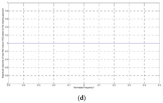 (a) Output of the loop filter when for under our proposed control strategy. (b) Output of the loop filter when for under the clipping strategy [7]. (c) Magnitude response of the output of the loop filter when for under our proposed control strategy. (d) Magnitude response of the output of the loop filter when for under the clipping strategy [7].