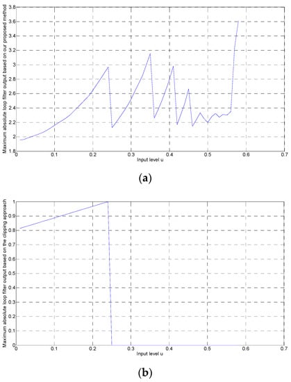 To further demonstrate the effects of the input step size on the stability of the sigma delta modulator, Figure 5a,b show the maximum absolute value of the output of the loop filter against the input step size under our proposed control strategy and the clipping control strategy [7], respectively. For our proposed control strategy, it can be seen from Figure 5a that the input step sizes being smaller than or equal to 0.58 will yield the maximum absolute values of the outputs of the loop filter being equal to nonzero. This means that the sigma delta modulator can be stabilized. However, the modulus of increases as the input step size increases. Eventually, . In this case, the sigma delta modulator cannot be stabilized. Therefore, it can be seen from Figure 5a that the maximum absolute values of the outputs of the loop filter are equal to zero when the input step sizes are larger than 0.58. On the other hand, for the clipping control method [7], it can be seen from Figure 5b that the input step sizes being smaller than or equal to 0.24 will yield the maximum absolute values of the outputs of the loop filter being equal to nonzero. However, the maximum absolute values of the outputs of the loop filter are equal to zero when the input step sizes are larger than 0.58. This also demonstrates that our proposed control method yields a wider stability region in terms of the input dynamical range.