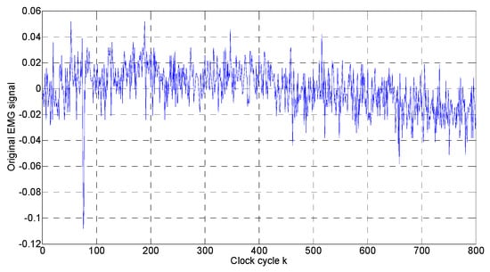 To demonstrate the application value of our proposed method, the sigma delta modulator is applied to an electromyogram [1]. Figure 8 shows the electromyogram. Figure 9a,b show the outputs of the loop filters under our control strategy and the clipping method [7], respectively. Figure 9c,d show the magnitude responses of the outputs of the loop filters under our control strategy and the clipping method [7], respectively. It can be seen from Figure 9a,c that the sigma delta modulator exhibits similar behavior to before for our proposed control strategy. This demonstrates the generality of our proposed method and the possibility of applying our proposed method to some practical signals.