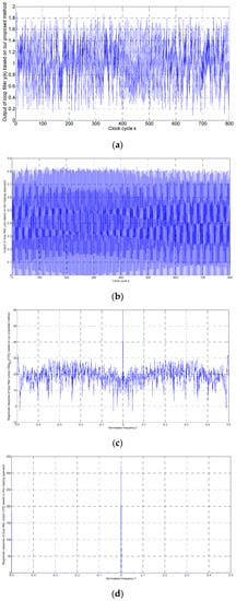 Next, a very large input step, which is equal to 0.58, is applied. Figure 4a,b show the outputs of the loop filters when our control strategy and the clipping method [7] are applied, respectively. Figure 4c,d show the magnitude responses of the outputs of the loop filters when our control strategy and the clipping method [7] are applied, respectively. It can be seen from Figure 4a,c that the sigma delta modulator also exhibits the similar behavior as before if our proposed control strategy is applied. Similarly, it can be seen from Figure 4b,d that the output of the loop filter is always zero under the clipping control strategy [7]. From here, it can be seen that our proposed control method can achieve a larger stability region in terms of the input dynamical range.