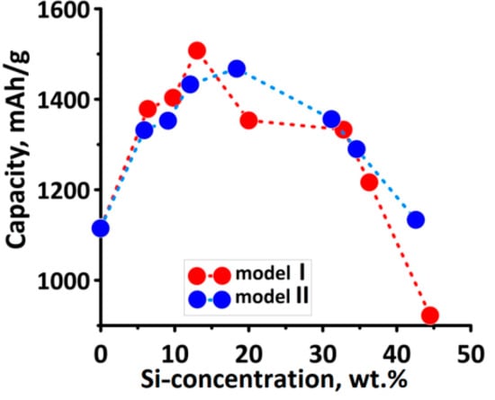 | Total Number of Atoms in the Supercell of the Composite | Number of Silicon Atoms in the Supercell (Si16 Cluster) | The Number of Lithium Ions in the Supercell | Mass Fraction of Silicon, wt.% | Li:C Ratio | Li:Si Ratio | Capacity of Pillared Graphene, mAh∙g−1 | Capacity of Si Clusters, mAh∙g−1 | Intermetallic Phase of Li×Si | Capacity of Electrode, mAh∙g−1 |