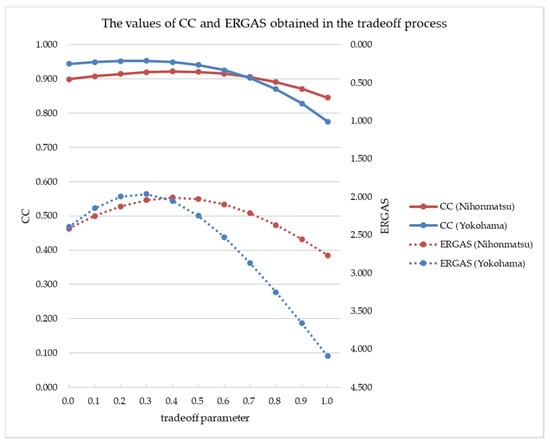 The values of CC and ERGAS obtained in the tradeoff process. CC: solid line, ERGAS: dotted line; Nihonmatsu: blue line, Yokohama: red line.