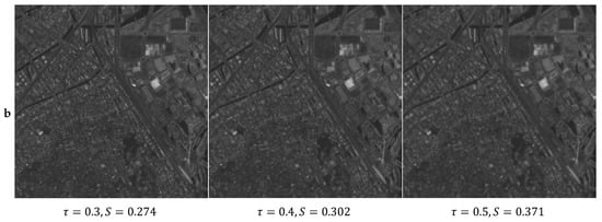The tradeoff parameter was determined as the value that minimizes Equation (24). Figure 4 displays the results of evaluation of the intensity of RGB images with various tradeoff parameters. The red line shows Nihonmatsu, the blue line shows Yokohama, the solid line is the result of CC, and the dotted line is the result of ERGAS. Figure 5 shows three images with some tradeoff parameter values. The lower the evaluation index S, the better the visual appearance. From these results, the value that minimized was for Nihonmatsu and for Yokohama. Therefore, in the following experimetns, was used for Nihonmatsu and was used for Yokohama.