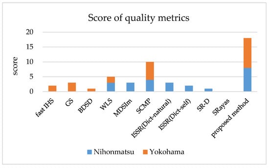 From the results in Table 4, it was found that the back-projection (BP) was effective from the viewpoint of improving spectral distortion. From the results in Table 5, it was found that the tradeoff process (TP) is effective in improving spectral distortion. Furthermore, since the TP was better than the individual methods of sparse representation (SR) and SCMP, it was clarified that these methods complementarily improve the spectral distortion. From the results in Table 6, it was found that the TP improved spectral distortion more than BP. In the results shown in Table 7 and Table 8, the method using GIHS (WLS and SCMP) was better than the existing methods using SR. In addition, it was found that the proposed method, the linear combination of SR and SCMP, gave better results than SCMP alone. One of the problems to be solved in PS processing is the independence of the processed image. In other words, it is important to obtain stable and good results rather than obtaining good results only on a specific image. Although there are some methods shown in Table 7 and Table 8 that gave better results than the proposed method, comparing the other evaluation results shows that the results were inconsistent. The reason why the evaluation results were so different could be that these processing methods depend on the processed image.