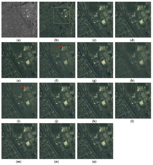 Figure 7 and Figure 8 show the reference and PS images from the Nihonmatsu and Yokohama datasets, respectively. Since the images were small, the enlarged image surrounded by the yellow frame of the original RGB image (b) is shown in (c)–(o). In Figure 7, in GS (f), the color of green was darker in the rice field area (indicated by the green arrow), while the forest area was whitish. BDSD (g) was more blurred than other images. In MDSIm (i), the color of the forest area was also whitish (indicated by the yellow arrow). In Figure 8, the vegetation area was whitish in GS (f) and MDSIm (i) (indicated by the red arrow). WLS (h) looked hazy. SR-D (m) had lower resolution than the other methods using sparse representation with back-projection. In both Figure 7 and Figure 8, the results of ISSR (k) (l) and SRayas (n) had ringing artefacts. Other images appeared to be reproduced without problems.