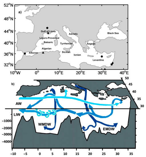 The Mediterranean circulation (Figure 1b) is driven, as the leading mechanism, by atmosphere-ocean interactions. This forcing depends on the heat and freshwater exchange and, hence, on the meteorological and oceanic conditions [19]. Since the average precipitation (P) and river runoff (R) do not balance the average evaporation (E) over the basin, a net inflow of Atlantic waters (AW) through the Strait of Gibraltar is necessary to compensate for the deficit. This compensation mechanism generates thermohaline circulation constituted by several cells [20,21]. The main one transports the AW entering the basin in the surface layer eastward, across the western and eastern basins, gradually increasing its salinity and density as a consequence of the evaporative losses. This modified Atlantic water (MAW) reaches the Levantine basin, where winter cooling caused by intense dry winds forces its sinking to intermediate depths (300–500 m), producing the Levantine intermediate water (LIW) [22].