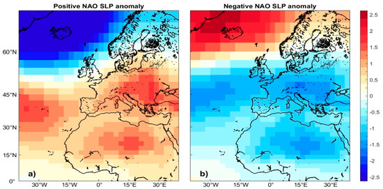The NAO index is a fundamental mode of the climatic variability in the northern hemisphere ([44,46,47]; see [48] for a review). It represents the dipolar pattern of the SLP characteristic of the North Atlantic-European region, with one center in the Azores high and the other in the Iceland low.