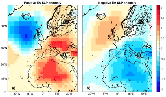 The EA pattern is defined as the SLP anomaly in the region between the two centers of the NAO dipole (approximately between Greenland and the British Islands–Baltic Sea area, Figure 3). When the EA is in a positive phase, this region is characterized by a negative SLP anomaly, enhancing strong cyclonic winds in the North Atlantic (Figure 3a). Conversely, a negative EA phase results in positive SLP anomalies (Figure 3b) that induce northeasterly flow of cold dry air, increasing the air–sea temperature and humidity gradients and leading to strong positive anomalies in the heat loss over the Mediterranean basin.