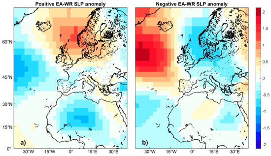The opposite effect of the EA–WR mode in the wind regime of the Eastern and Western Mediterranean generates a dipolar pattern in the net heat anomalies over the basin. A positive EA–WR mode is associated with higher latent heat losses in the Eastern Mediterranean, with positive anomalies up to 15 Wm−2 in the Levantine basin, while negative latent heat loss anomalies are simultaneously observed in the Balearic and Adriatic seas [54]. This dipolar pattern can be explained considering the sea level pressure anomaly (SLPA) associated with the positive phase of EA–WR (Figure 4a): the higher SLPA over Northern Europe forces a northerly flow of cold dry air over the eastern basin but a southerly flow of relatively warm moist air over the western basin, this producing net heat anomalies of different signs. In the negative phase, opposite conditions prevail (Figure 4b) and thus sign variations of EA–WR have the potential to induce a see-saw behavior in the heat budgets of the eastern and western sub-basins, a result also presented by other authors [28], who discussed the relevant impact of this mode on winter heat flux.