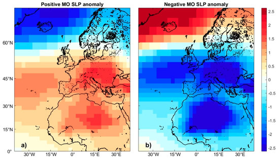 Stronger/weaker phases of the NAO are related to variations in the position and intensity of the North Atlantic jet stream (NAJS) and the storm track, along with large-scale changes in the zonal and meridional heat and moisture transport, which are reflected in changes in the temperature and precipitation patterns of wide regions, including the Mediterranean Sea. To clearly show this, we display the composites of sea level pressure anomalies (mbar) for the positive (higher quartile) and negative (lower quartile) phases of NAO (Figure 2 and the same for all indices in Figure 2, Figure 3, Figure 4 and Figure 5). Monthly mean sea level pressure at 2.5° × 2.5° for the period 1948–2009 from the National Centre for Environmental Prediction (NCEP) has been used.