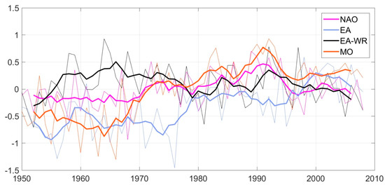 It is worth pointing out that, while NAO, EA and EA–WR can be considered independent modes of the same EOF analysis, this is not the case for the MO. The NAO and MO patterns have important similarities, both with positive (negative) phases characterized by higher (lower) SLP anomalies over the Mediterranean (Figure 5). The two indices are strongly influenced by the Northeast Atlantic low systems that force the Mediterranean cyclogenesis [62], and thus their annual time series are highly correlated (~0.6 [54]; see also Figure 6). The MO can be understood as an oscillation of sea level pressure anomalies in the Central and Western Mediterranean, an important source of cyclogenesis. Since the appearance of these cyclones is partially connected with the activity of North Atlantic fronts governed by NAO, a high correlation is expectable. During winter, the southern center of the NAO is placed closer to the Mediterranean and, hence, the best correlation for all variables is always achieved by the winter NAO index. However, in summer and spring, the southern center of the NAO moves westward [34] and lower correlation is observed. On the contrary, since its center remains rather stable, the influence of MO in the Mediterranean is noticeable in all seasons. The MO index is also able to capture the effects of other low-frequency atmospheric modes in the Mediterranean SLP field. In particular, the influence of the EA (annual correlation of 0.43) but also the winter EA–WR and Scandinavian (SCAN) modes [29] are noticeable. Therefore, this provides a more complete picture of the large-scale atmospheric impact over the Mediterranean, emerging as a rather accurate index to describe the basin climatological freshwater and (especially) heat budgets.