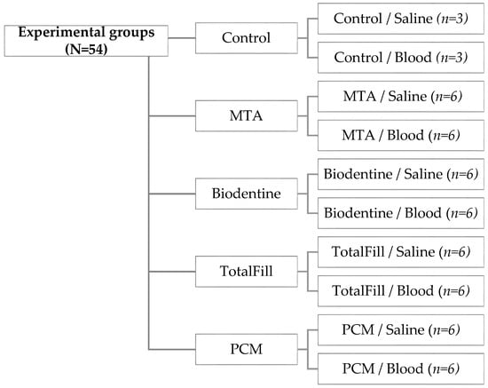After preoperative color measurement of each specimen, cavities in the control group were filled with a sterile cotton pellet moistened with saline solution (negative control–Control/Saline) and blood (positive control-Control/Blood), respectively. The access cavities of the remaining experimental groups were filled with different combinations of liquid solution (saline solution or blood) and biomaterial (ProRoot MTA, Biodentine, TotalFill BC, and PCM) as follows: MTA/Saline; MTA/Blood; Biodentine/Saline; Biodentine/Blood; TotalFill/Saline; TotalFill/Blood; PCM/Saline and PCM/Blood.