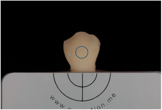 Color assessment was performed by a single operator using ImageJ (National Institutes of Health, NIH) software, considering a central circular area, focusing on the height and width of the tooth crown, with the total area of 256 × 256 pixels. The color space was measured with the rules of the Commission International de l’Eclairage (CIE) L* a* b* system, with L* values corresponding to the lightness or luminance (ranging from 0 [black] to 100 [white]), a* values matching the red-green axis (red—positive a*; green—negative a*) and the values of b* exhibiting the yellow-blue axis (yellow—positive b*; blue—negative b*). ΔE describes the color variation between baseline and each of the subsequent color measurement periods of evaluation (TPO, T72H, T7D, and T6M), determined by using the following formula: