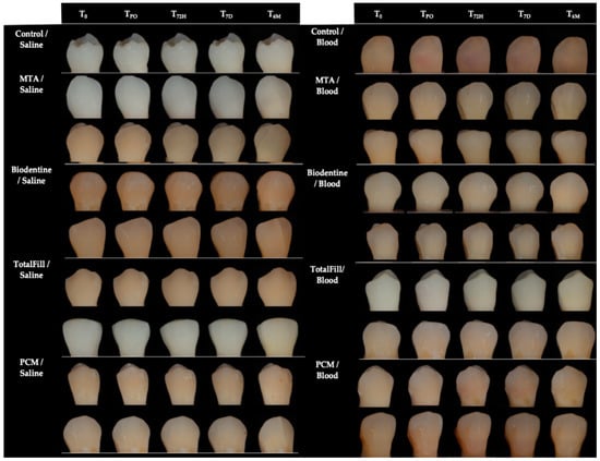 Thus, the aim of the present ex vivo study was to assess and compare coronal discoloration induced by four endodontic biomaterials used in REPs—ProRoot MTA, Biodentine, TotalFill BC Putty, and an experimental pulp capping material (PCM)—in the presence of saline solution or blood. The null hypothesis states that there are no statistically significant differences between the experimental groups.