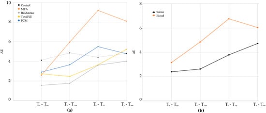 Color variation (ΔE) over time considering only the (a) materials (mineral trioxide aggregate (MTA), Biodentine, TotalFill, and PCM) and (b) treatment (Saline and Blood) variation.