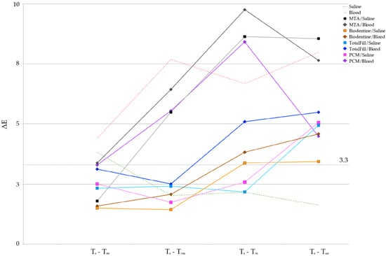 Perceptible chromatic alterations for the human eye were defined at the threshold value of ΔE ≥ 3.3 [].