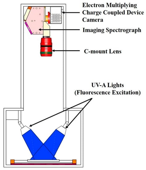 In this study, a hyperspectral fluorescence imaging system was used to acquire the HSIs of the rice samples. It consisted of two UV-A excitation lights, a sample translation stage, and the acquisition part of the hyperspectral fluorescence image (Figure 2). The latter was equipped with a slit for the line scan, a high-sensitivity electron multiplying charge coupled device (EMCCD; MegaLuca R, ANDOR Technology, South Windsor, CT, USA) with 1004 × 1002 pixels, an image spectrograph, and a C-mount lens (F1.9 35 mm compact lens, Schneider Optics, Hauppauge, NY, USA). EMCCD has a pixel size of 8 × 8 μm, is cooled down to −20 °C via thermoelectric cooling and can capture 14-bit images at a frequency of 12.5 MHz. The image spectrograph and C-mount lens were fixed in front of the EMCCD. The UV-A excitation lights were vertically tilted at 15° to excite the samples. The HSI was captured in the spectral range of 420–780 nm, with intervals of 4.8 nm. The image field-of-view was determined using a 25 µm × 18 mm (width × length) slit size. The line scan image, acquired through the slit, was spectrally irradiated on the EMCCD surface through a diffraction grating to generate a spectral image for each wavelength band. The horizontal and vertical axes of each line scan image included the respective spatial and spectral information.