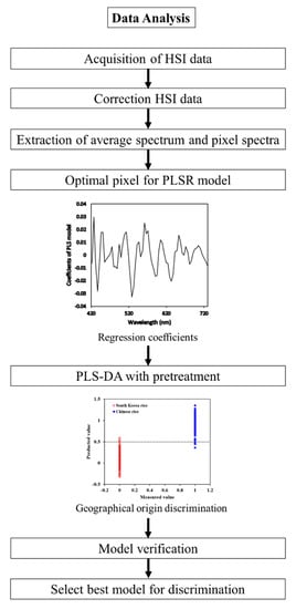 A flowchart of the experiment is shown in Figure 3. To discriminate between the South Korean and Chinese rice, the HSI was analyzed by PLS-DA and PLSR. These are statistical mathematical operations that are used to develop a regression model between the measured spectrum and the dependent variable. In this study, PLS-DA and PLSR were developed using the mean value spectrum and the pixel spectrum of the rice samples, respectively. The values of the South Korean and Chinese rice groups were respectively set to ‘0’ and ‘1’. The basic model of multivariate PLS-DA and PLSR is shown in Equations (2) and (3) [11].